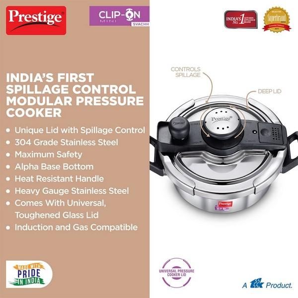 The Prestige Clip-On Svachh pressure cooker range is modular in design, which means you can use the same lid on all utensils in the range.