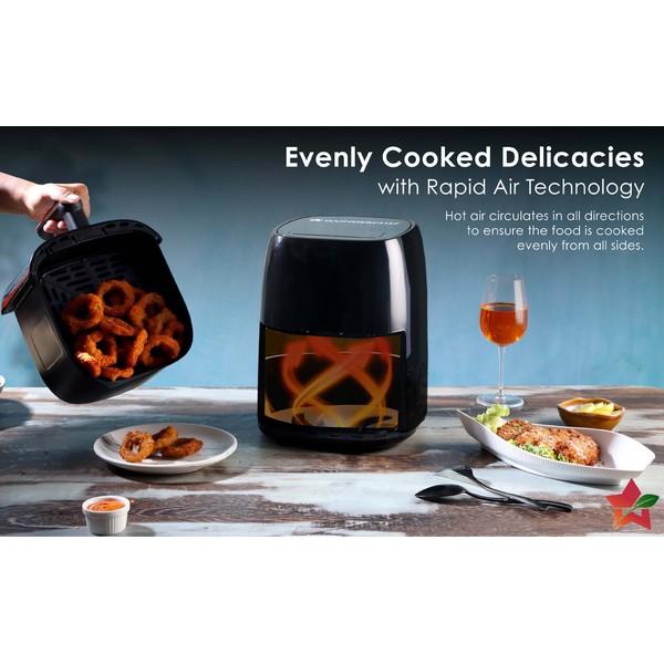 Grill, fry, bake and roast with rapid air technology. Pre-set functions on digital display for added convenience. Healthy cooking with almost no oil. Equipped with time and temperature control, auto shut-off feature. Spacious 4.5L capacity. 1500W | 4.5L.
