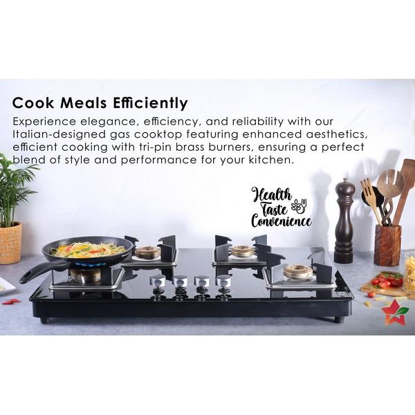 High efficiency forged brass burners, toughened glass and ergonomically designed knobs make it the perfect choice for all types of kitchens