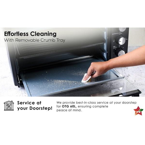 Heat-resistant tempered glass window can withstand high temperature & is safe to use Removable crumb tray for easy cleaning Inside lamp for clear visibility throughout the cooking process Ideal convection mode for faster, uniform cooking & browning