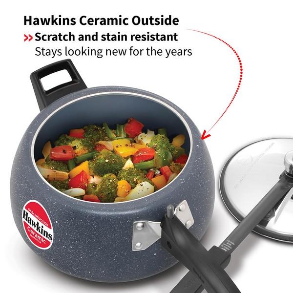 deal for 3 or 4 Persons. New Hawkins Ceramic Nonstick Inside: Excellent release properties - Uses less oil. Not spoilt by high heat - Can cook crisper, tastier. German Ceramic - High quality, lasts longer. No PFAS, Heavy Metals - Ceramic based revolutionary nonstick. Attractive Ceramic Coating Outside - Scratch and stain resistant. Stays looking new for years. The Hawkins Ceramic Nonstick Induction Pressure Cooker is ideal for 3 or 4 persons. The Hawkins Ceramic Nonstick has excellent release properties, which means that it uses less oil when cooking. Additionally, the nonstick coating is not spoiled by high heat, which allows you to cook crisper and tastier food. The German ceramic used in the nonstick coating is of high quality and lasts longer, making it a durable option for your kitchen. Another advantage of this cooker is that the Hawkins Ceramic Nonstick does not contain PFAS or heavy metals, making it a healthier and safer option for cooking. The attractive ceramic coating on the outside is scratch and stain resistant, which means that it will stay looking new for years to come. In terms of performance, this cooker cooks fast and requires less oil. It also works on both gas and induction stovetops, making it a versatile option for any kitchen. Overall, this cooker is an excellent choice for anyone who wants to cook healthy and tasty food quickly and easily