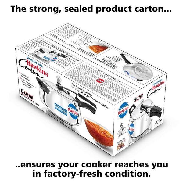 Built from non-magnetic stainless steel, the Hawkins Contura Stainless Steel Induction Pressure Cooker’s lid and body are tough and durable. The external base is made from stainless steel, which makes this pressure cooker compatible with induction cooktops. Additionally, its thick sandwich bottom allows uniform heating for quick cooking and does not develop hotspots. Moreover, the base always remains fat and does not bulge, which makes it easy to place on the burner.