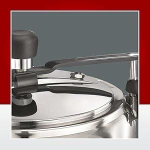 CONTROLLED GASKET RELEASE SYSTEM: When there is excess build-up of pressure within the pressure cooker, the Gasket bulges out through the slit from the side in the lid of the pressure cooker.