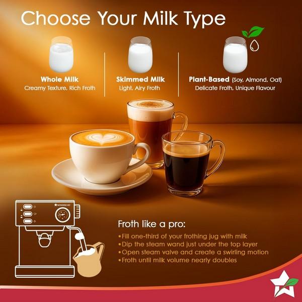 19-Bar Pump Pressure: The 19-bar pressure pump ensures precise and consistent extraction of coffee flavours, producing rich, crema-topped espresso shots for the perfect coffee indulgence.