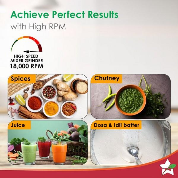3 Jars for Multiple Tasks: 1.5L blending jar, 1L dry grinding jar, 400ml chutney and spice grinding jar.