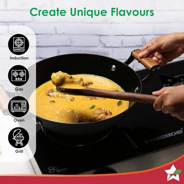 ENHANCED MULTI-LAYERED CONSTRUCTION: The Wonderchef Nigella Tri-Ply Kadhai’s aluminum core is sandwiched between two non-toxic, high-grade steel layers, providing exceptional heat conduction and unmatched durability for daily use.