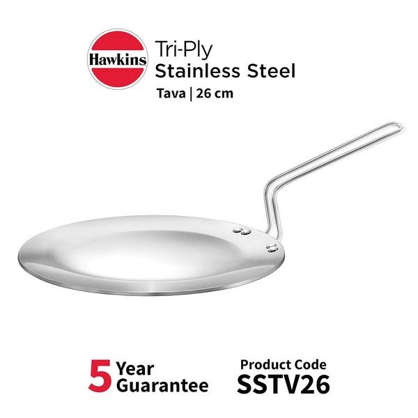 Hawkins Tri-ply Stainless Steel Tava is designed to give you all the advantages of cooking in stainless steel while minimizing the disadvantages of sticking and burning that are normally associated with ordinary stainless steel. The cooking surface (inner surface) is made from 18/8 food-grade (AISI 304) stainless steel which is extremely hygienic, most durable, does not react with most foods and does not pit or corrode. The heavy gauge aluminium core spreads heat well for even cooking with no hot spots, and retains heat for quick cooking. It is sandwiched between two layers of stainless steel and does not come in contact with food on the cooking surface. The base (outer surface) is made of AISI 430 grade magnetic stainless steel. Hence this cookware can be used on all domestic gas, induction, electric, ceramic and halogen cooktops. Hawkins tri-ply stainless steel Tava is durable, well-balanced and stays flat for quick cooking on gas, induction and electric cooktops. The 3.5 mm extra thick tava has a unique shape with a flat base and gentle sloping sides has just the right curvature for optimal cooking results - oil does not pool, nor spill over the sides. The placement of the rivets is carefully designed to maximise the cooking area. The strong 6.0 mm thick stainless steel stay-cool wire handle is comfortable and safe to hold even when the tava is hot.
