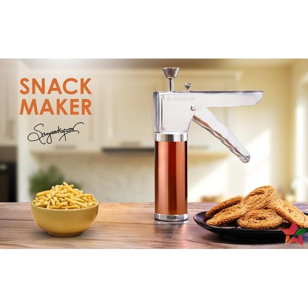 Make healthy snacks at home - chakli, sev, bhujia, papdi, fafda, salli, gathiya and more. Crafted from high-quality stainless steel, this kitchen tool is sturdy and durable. 12 varied shaped plates to make different types of snacks with ease. Easy to use - press lightly to roll out the dough directly into the kadhai.
