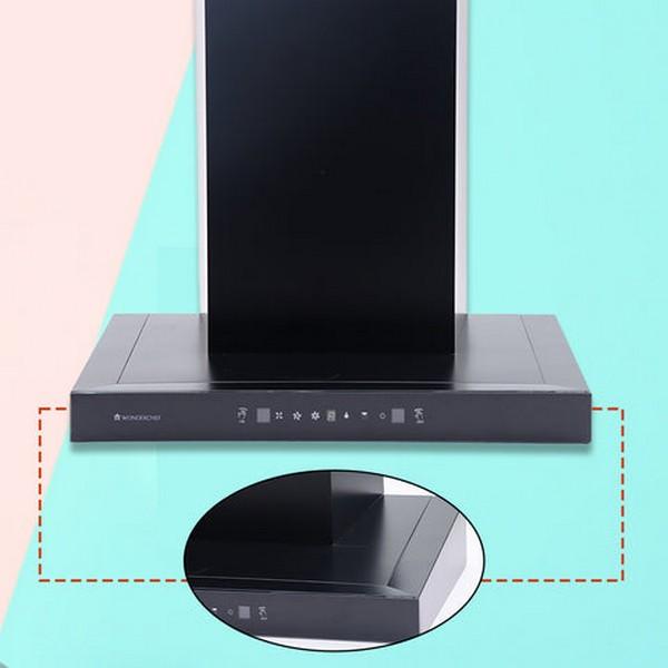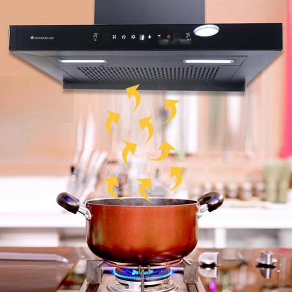 Classy and efficient low noise chimneys, with LED lights, powerful suction capacity of 1400 M 3 / h , gesture and touch control for speed and power, LED light, tempered glass, auto-clean technology.